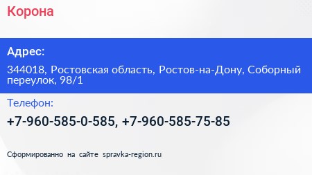 Корона по адресу 344018, Ростовская область, Ростов-на-Дону, Соборный переулок, 98/1 в дальнейшем Организация, размещена в следующих категориях: