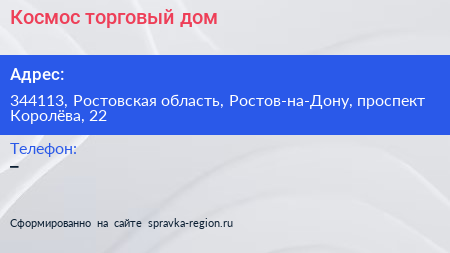 Космос, торговый дом по адресу 344113, Ростовская область, Ростов-на-Дону, проспект Королёва, 22 в дальнейшем Организация, размещена в следующих категориях: