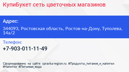 КупиБукет, сеть цветочных магазинов по адресу 344093, Ростовская область, Ростов-на-Дону, Туполева, 14а/2 в дальнейшем Организация, размещена в следующих категориях: