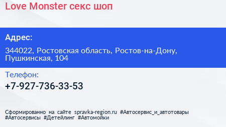 Love Monster, секс-шоп по адресу 344022, Ростовская область, Ростов-на-Дону, Пушкинская, 104 в дальнейшем Организация, размещена в следующих категориях:
