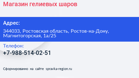 Магазин гелиевых шаров по адресу 344033, Ростовская область, Ростов-на-Дону, Магнитогорская, 1а/25 в дальнейшем Организация, размещена в следующих категориях: