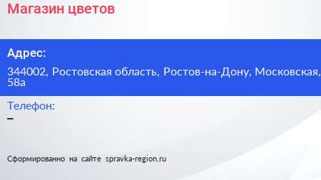 Магазин цветов по адресу 344002, Ростовская область, Ростов-на-Дону, Московская, 58а в дальнейшем Организация, размещена в следующих категориях: