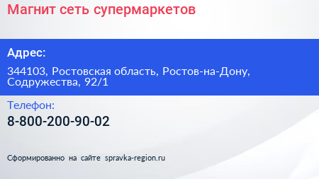 Магнит, сеть супермаркетов по адресу 344103, Ростовская область, Ростов-на-Дону, Содружества, 92/1 в дальнейшем Организация, размещена в следующих категориях: