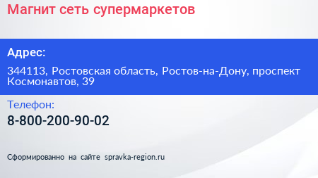 Магнит, сеть супермаркетов по адресу 344113, Ростовская область, Ростов-на-Дону, проспект Космонавтов, 39 в дальнейшем Организация, размещена в следующих категориях: