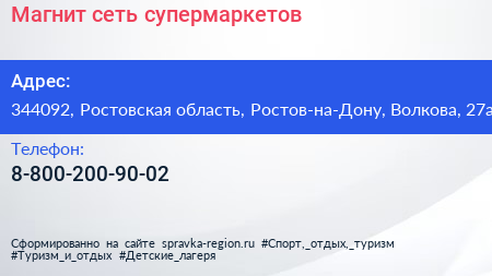 Магнит, сеть супермаркетов по адресу 344092, Ростовская область, Ростов-на-Дону, Волкова, 27а в дальнейшем Организация, размещена в следующих категориях: