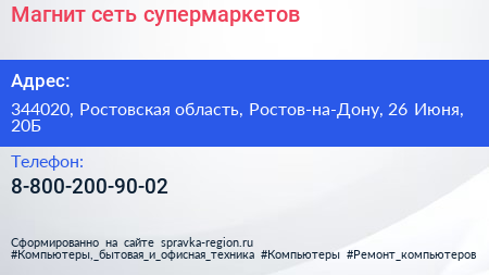 Магнит, сеть супермаркетов по адресу 344020, Ростовская область, Ростов-на-Дону, 26 Июня, 20Б в дальнейшем Организация, размещена в следующих категориях:
