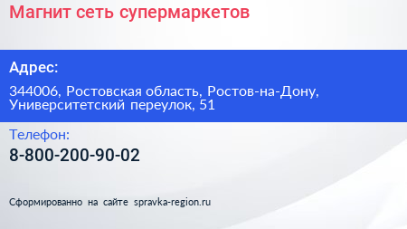 Магнит, сеть супермаркетов по адресу 344006, Ростовская область, Ростов-на-Дону, Университетский переулок, 51 в дальнейшем Организация, размещена в следующих категориях: