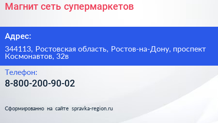 Магнит, сеть супермаркетов по адресу 344113, Ростовская область, Ростов-на-Дону, проспект Космонавтов, 32в в дальнейшем Организация, размещена в следующих категориях: