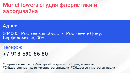 MarieFlowers, студия флористики и аэродизайна по адресу 344000, Ростовская область, Ростов-на-Дону, Варфоломеева, 306 в дальнейшем Организация, размещена в следующих категориях: