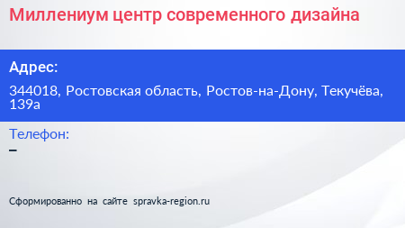 Миллениум, центр современного дизайна по адресу 344018, Ростовская область, Ростов-на-Дону, Текучёва, 139а в дальнейшем Организация, размещена в следующих категориях: