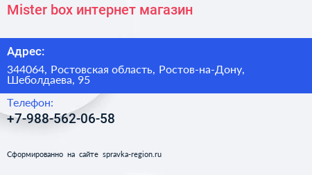 Mister box, интернет-магазин по адресу 344064, Ростовская область, Ростов-на-Дону, Шеболдаева, 95 в дальнейшем Организация, размещена в следующих категориях:
