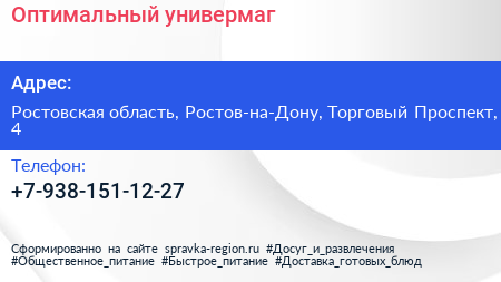 Оптимальный, универмаг по адресу Ростовская область, Ростов-на-Дону, Торговый Проспект, 4 в дальнейшем Организация, размещена в следующих категориях: