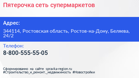 Пятерочка, сеть супермаркетов по адресу 344114, Ростовская область, Ростов-на-Дону, Беляева, 24/2 в дальнейшем Организация, размещена в следующих категориях: