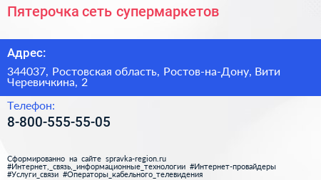Пятерочка, сеть супермаркетов по адресу 344037, Ростовская область, Ростов-на-Дону, Вити Черевичкина, 2 в дальнейшем Организация, размещена в следующих категориях: