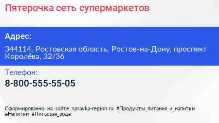 Пятерочка, сеть супермаркетов по адресу 344114, Ростовская область, Ростов-на-Дону, проспект Королёва, 32/36 в дальнейшем Организация, размещена в следующих категориях:
