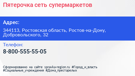 Пятерочка, сеть супермаркетов по адресу 344113, Ростовская область, Ростов-на-Дону, Добровольского, 32 в дальнейшем Организация, размещена в следующих категориях: