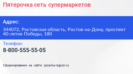Пятерочка, сеть супермаркетов по адресу 344072, Ростовская область, Ростов-на-Дону, проспект 40-летия Победы, 180 в дальнейшем Организация, размещена в следующих категориях: