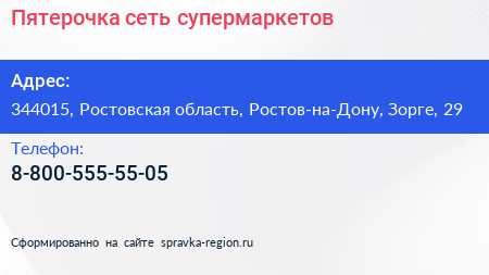Пятерочка, сеть супермаркетов по адресу 344015, Ростовская область, Ростов-на-Дону, Зорге, 29 в дальнейшем Организация, размещена в следующих категориях: