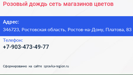 Розовый дождь, сеть магазинов цветов по адресу 346723, Ростовская область, Ростов-на-Дону, Платова, 83 в дальнейшем Организация, размещена в следующих категориях: