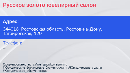 Русское золото, ювелирный салон по адресу 344016, Ростовская область, Ростов-на-Дону, Таганрогская, 120 в дальнейшем Организация, размещена в следующих категориях: