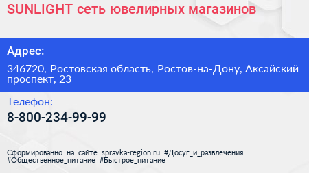SUNLIGHT, сеть ювелирных магазинов по адресу 346720, Ростовская область, Ростов-на-Дону, Аксайский проспект, 23 в дальнейшем Организация, размещена в следующих категориях: