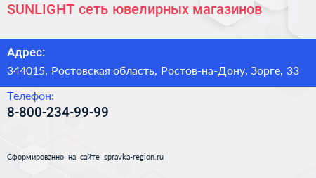 SUNLIGHT, сеть ювелирных магазинов по адресу 344015, Ростовская область, Ростов-на-Дону, Зорге, 33 в дальнейшем Организация, размещена в следующих категориях: