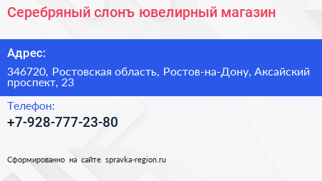 Серебряный слонъ, ювелирный магазин по адресу 346720, Ростовская область, Ростов-на-Дону, Аксайский проспект, 23 в дальнейшем Организация, размещена в следующих категориях: