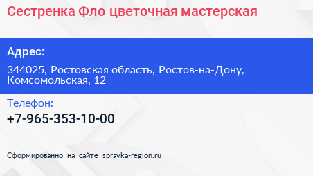Сестренка Фло, цветочная мастерская по адресу 344025, Ростовская область, Ростов-на-Дону, Комсомольская, 12 в дальнейшем Организация, размещена в следующих категориях: