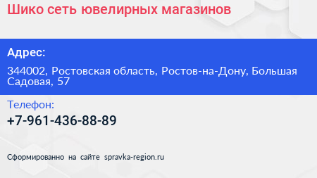 Шико, сеть ювелирных магазинов по адресу 344002, Ростовская область, Ростов-на-Дону, Большая Садовая, 57 в дальнейшем Организация, размещена в следующих категориях: