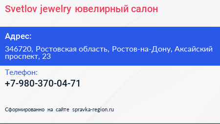 Svetlov jewelry, ювелирный салон по адресу 346720, Ростовская область, Ростов-на-Дону, Аксайский проспект, 23 в дальнейшем Организация, размещена в следующих категориях: