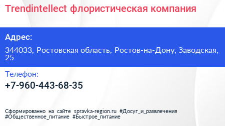 Trendintellect, флористическая компания по адресу 344033, Ростовская область, Ростов-на-Дону, Заводская, 25 в дальнейшем Организация, размещена в следующих категориях:
