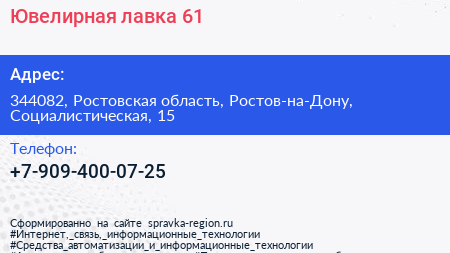 Ювелирная лавка 61 по адресу 344082, Ростовская область, Ростов-на-Дону, Социалистическая, 15 в дальнейшем Организация, размещена в следующих категориях: