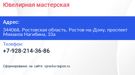 Ювелирная мастерская по адресу 344068, Ростовская область, Ростов-на-Дону, проспект Михаила Нагибина, 33а в дальнейшем Организация, размещена в следующих категориях: