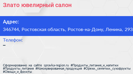 Злато, ювелирный салон по адресу 346744, Ростовская область, Ростов-на-Дону, Ленина, 293 в дальнейшем Организация, размещена в следующих категориях: