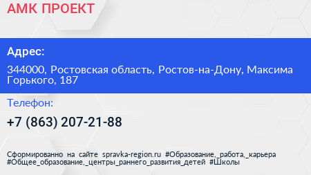 АМК-ПРОЕКТ по адресу 344000, Ростовская область, Ростов-на-Дону, Максима Горького, 187 в дальнейшем Организация, размещена в следующих категориях: