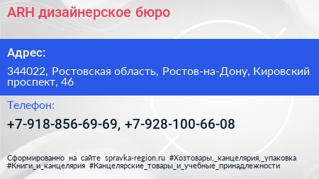 ARH, дизайнерское бюро по адресу 344022, Ростовская область, Ростов-на-Дону, Кировский проспект, 46 в дальнейшем Организация, размещена в следующих категориях: