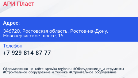 АРИ-Пласт по адресу 346720, Ростовская область, Ростов-на-Дону, Новочеркасское шоссе, 15 в дальнейшем Организация, размещена в следующих категориях: