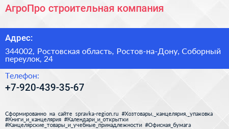 АгроПро, строительная компания по адресу 344002, Ростовская область, Ростов-на-Дону, Соборный переулок, 24 в дальнейшем Организация, размещена в следующих категориях: