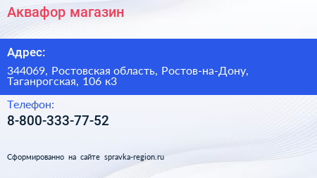 Аквафор, магазин по адресу 344069, Ростовская область, Ростов-на-Дону, Таганрогская, 106 к3 в дальнейшем Организация, размещена в следующих категориях: