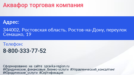 Аквафор, торговая компания по адресу 344002, Ростовская область, Ростов-на-Дону, переулок Семашко, 19 в дальнейшем Организация, размещена в следующих категориях: