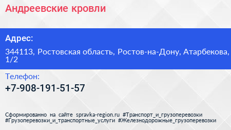 Андреевские кровли по адресу 344113, Ростовская область, Ростов-на-Дону, Атарбекова, 1/2 в дальнейшем Организация, размещена в следующих категориях: