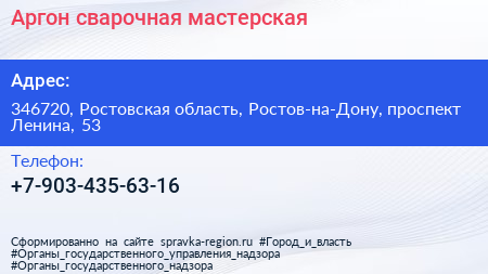 Аргон, сварочная мастерская по адресу 346720, Ростовская область, Ростов-на-Дону, проспект Ленина, 53 в дальнейшем Организация, размещена в следующих категориях: