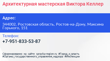 Архитектурная мастерская Виктора Келлер по адресу 344002, Ростовская область, Ростов-на-Дону, Максима Горького, 151 в дальнейшем Организация, размещена в следующих категориях: