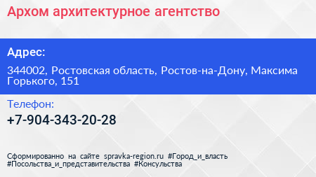 Архом, архитектурное агентство по адресу 344002, Ростовская область, Ростов-на-Дону, Максима Горького, 151 в дальнейшем Организация, размещена в следующих категориях: