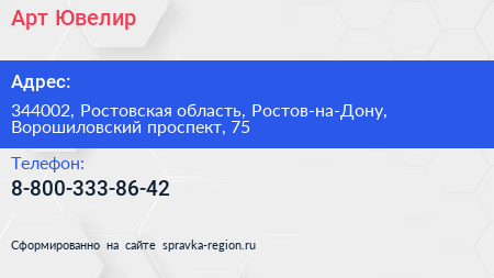 Арт-Ювелир по адресу 344002, Ростовская область, Ростов-на-Дону, Ворошиловский проспект, 75 в дальнейшем Организация, размещена в следующих категориях: