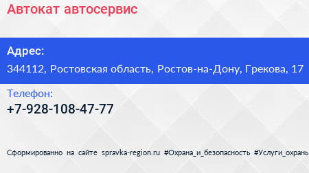 Автокат, автосервис по адресу 344112, Ростовская область, Ростов-на-Дону, Грекова, 17 в дальнейшем Организация, размещена в следующих категориях: