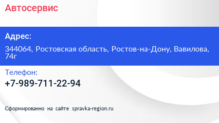 Автосервис по адресу 344064, Ростовская область, Ростов-на-Дону, Вавилова, 74г в дальнейшем Организация, размещена в следующих категориях: