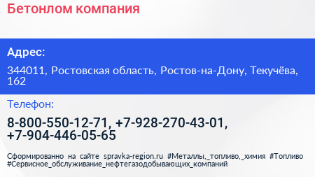 Бетонлом, компания по адресу 344011, Ростовская область, Ростов-на-Дону, Текучёва, 162 в дальнейшем Организация, размещена в следующих категориях: