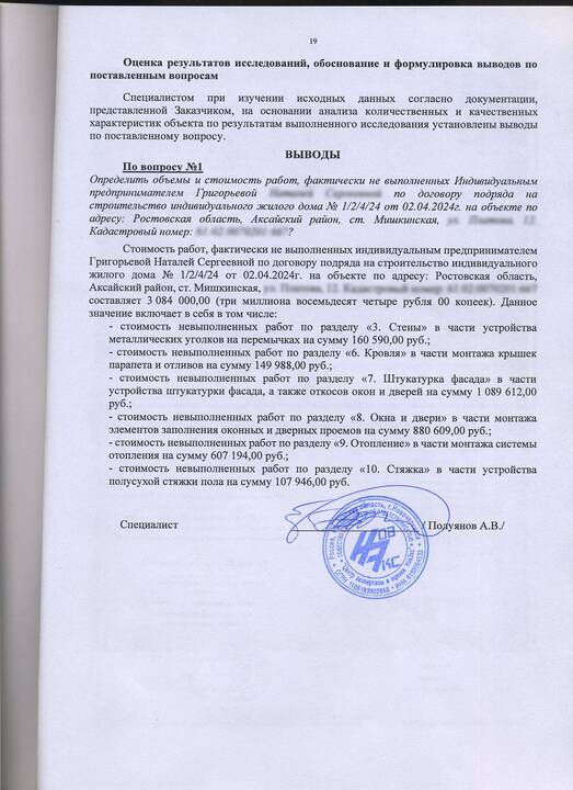 В феврале 2025 г. по рекомендации технадзора, обратился к Константину, чтобы заказать алюминиевые витражи вместо ПВХ, мне сделали перерасчет и предложили перевести 400 тысяч в качестве доплаты Пономарёвой Е. В. без доп. соглашения! Сроки строительства подходили и Константин предложил заключить доп. соглашение, продлив их до конца мая 2025 г. 10 апреля вышла бригада каменщиков, стали выкладывать парапеты, далее стройка опять заглохла, тогда я уже подключил юристов, чтобы готовить досудебные претензии и готовиться к суду с Григорьевой Н. С.