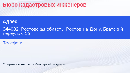 Бюро кадастровых инженеров по адресу 344082, Ростовская область, Ростов-на-Дону, Братский переулок, 56 в дальнейшем Организация, размещена в следующих категориях: